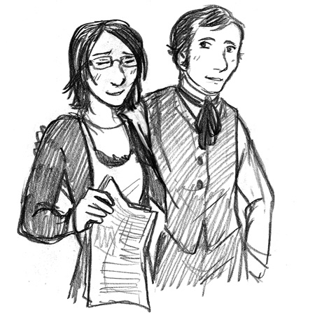 "You were saying?" The Doctor laughed and almost leapt over the railing to chase James down before he got too far. When I ran after him, The Doctor had caught James standing in front of the room I had used before. The tall young man gazed inside with an odd expression.