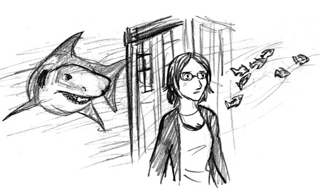 The shark plowed into my back, knocking me far across the top of the building. The jolt somehow knocked me out of the trance I was in, and I looked up with a look of utter confusion on my face. The Doctor recognized what had happened and tried getting to me before the shark did.