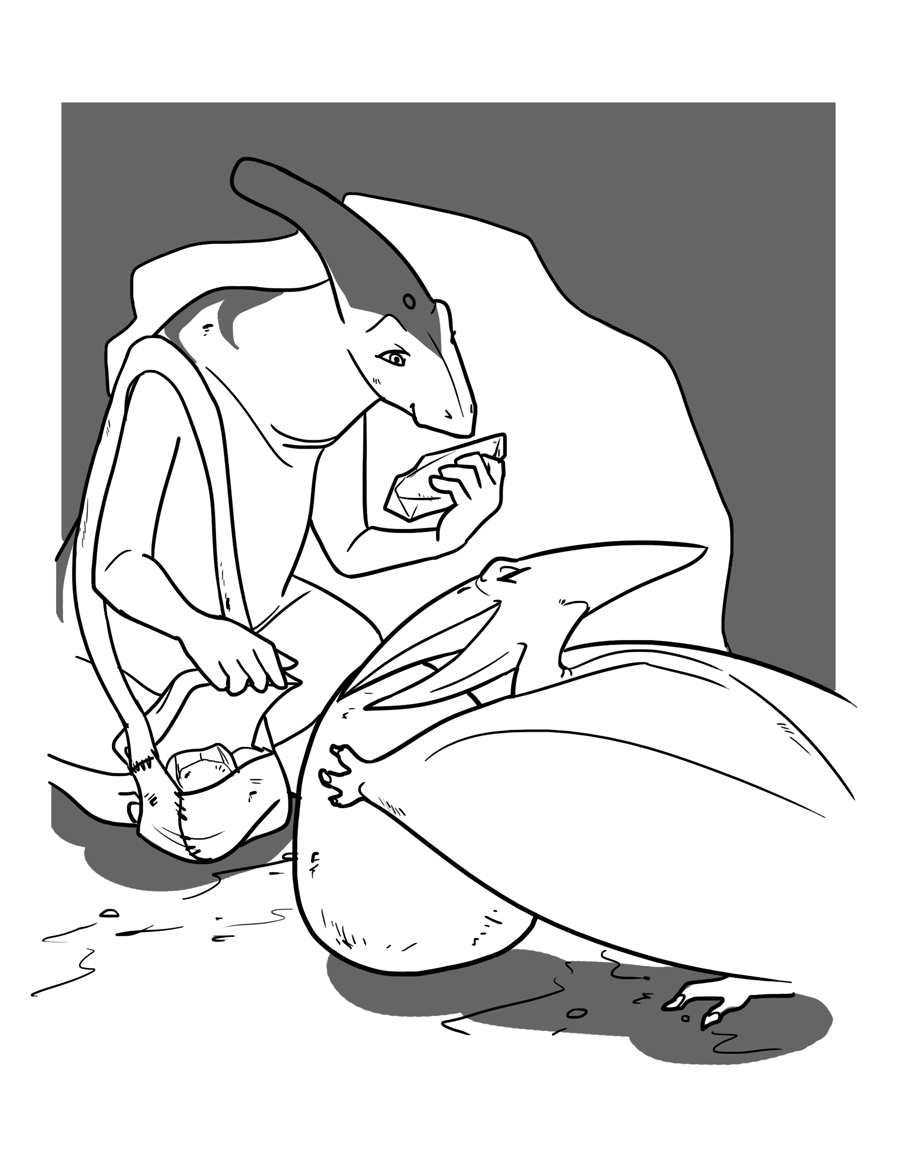 “Ah, purple, yes! That will go well with your scales!” Treeka waved her wing as she turned. “I know just the thing!” She started moving pieces of her pile almost methodically until she uncovered a crystalline purple stone exactly as Kotah had described. “Here!” Treeka announced, lifting the moderately sized stone over her head. “You like?”