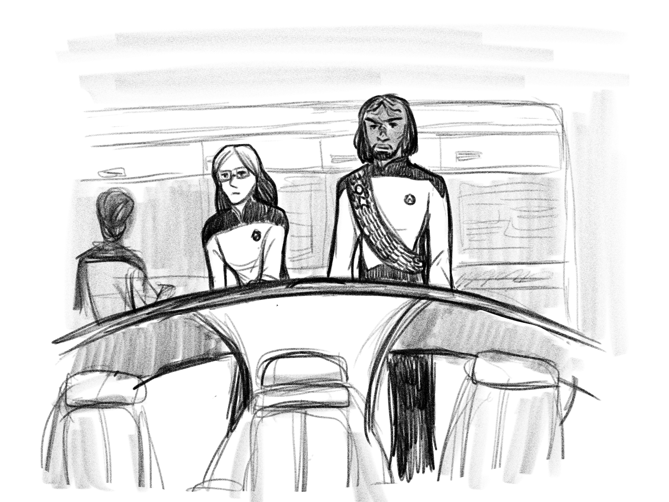 Commander Riker glanced up at Gemini and Worf, offering them a grin that stretched the beard upon his chin. His short black hair was neatly combed, and his blue eyes drifted down to meet Deanna. She smiled at him before settling her hands on her knee and looking forward. Her long, curly hair was half-pulled up in a high ponytail, and its dark brown tone contrasted her light skin and rose-colored jumpsuit.