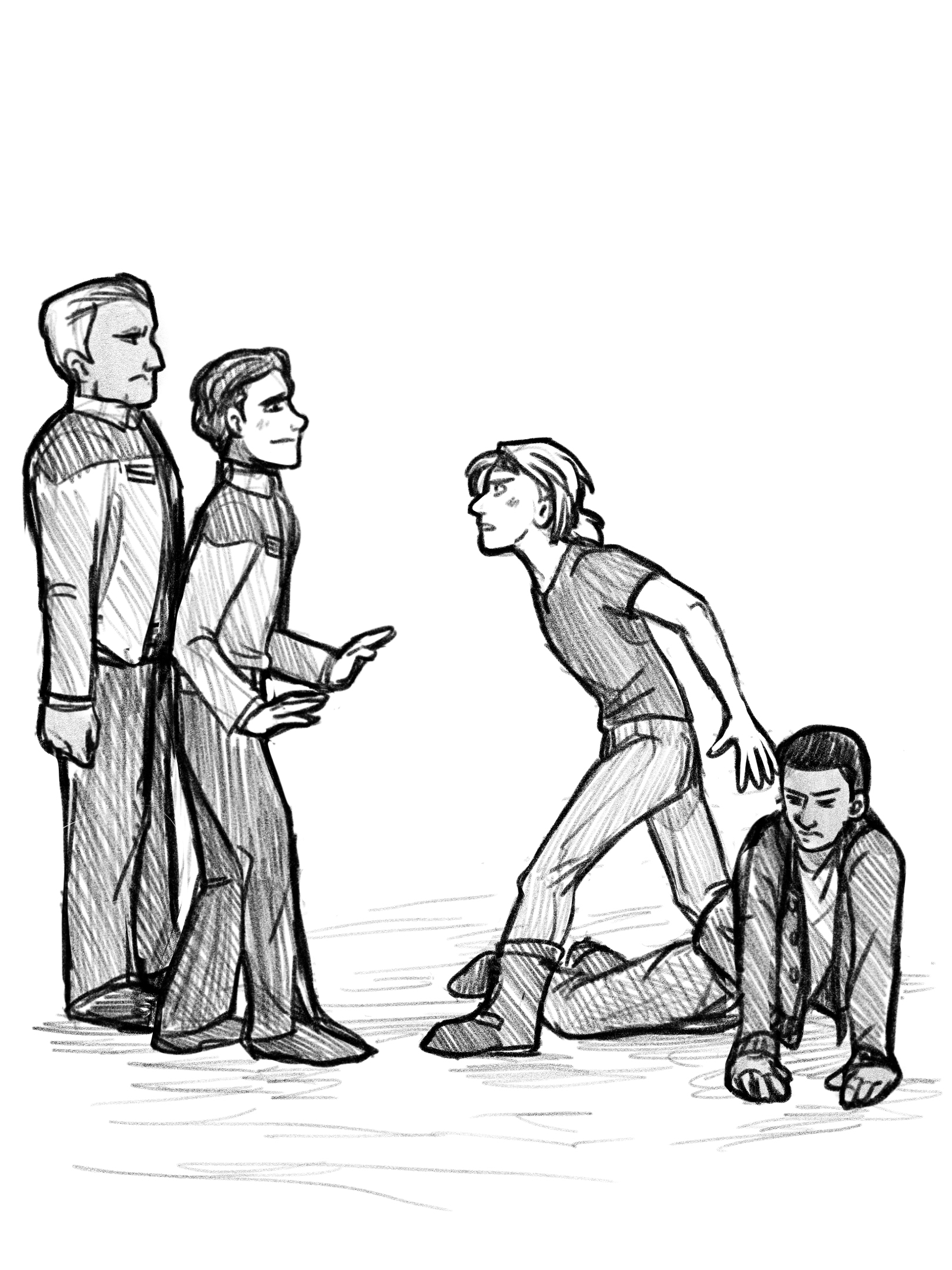 “I do apologize in the way this has been handled,” Cason began, “and I’ll start by introducing myself: I am Flint Cason, Lieutenant Commander of NAGI, or the New Arden Governing Institution. Beside me is Commander Konstantin. And you are?”