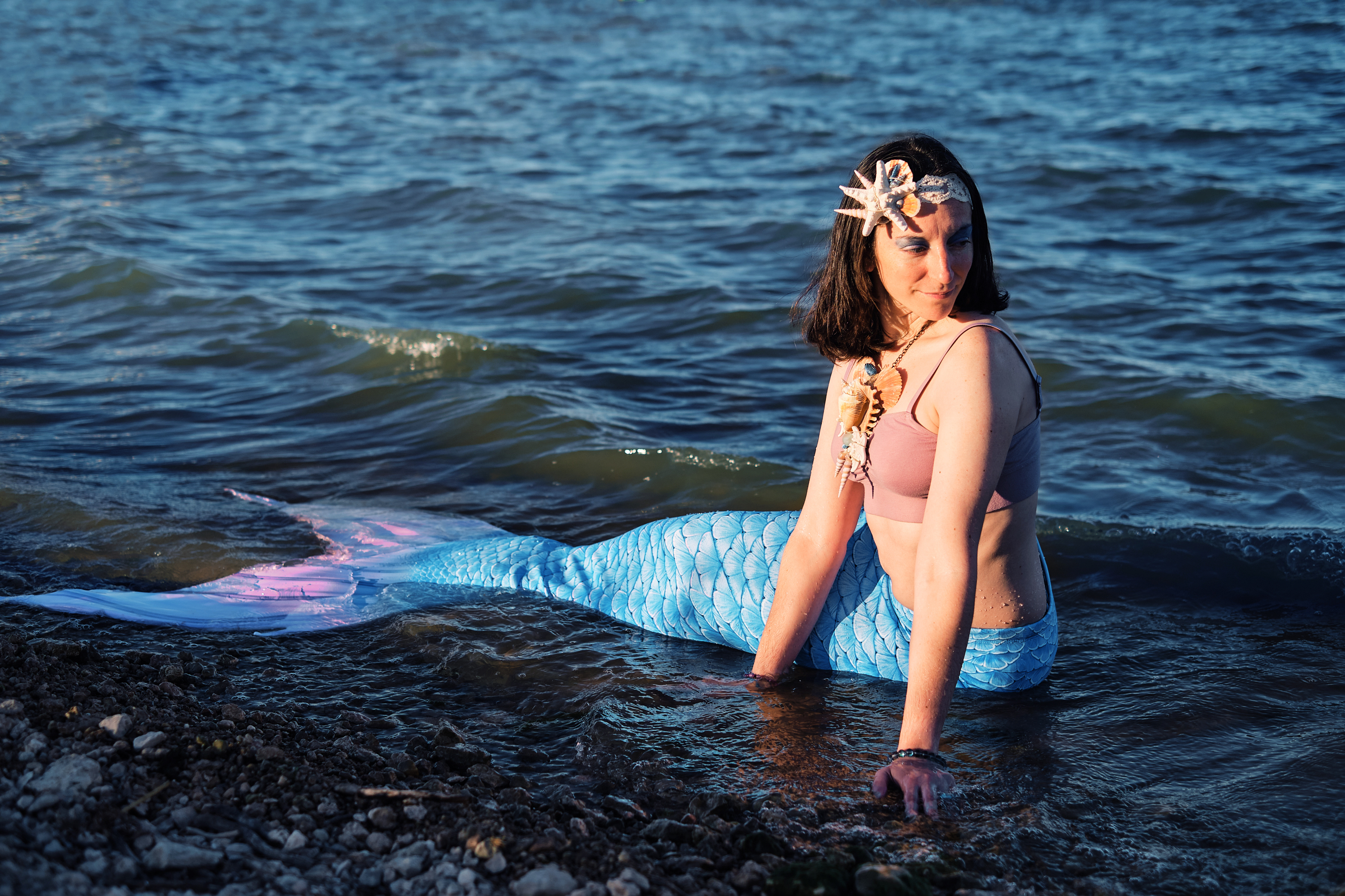Sapphyre rest in the shallow water in the golden light of evening.