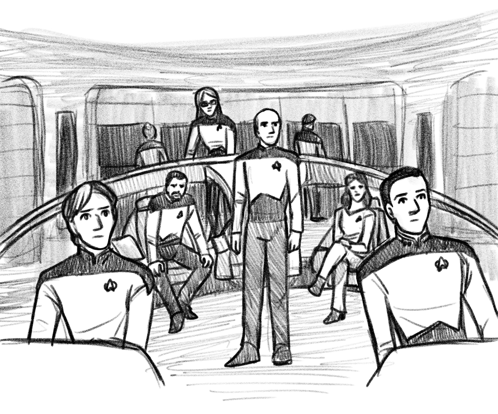 Jean-Luc nodded, his eyes unfocused. “Number One, I want you, Commander Data, and Ensign Gallagher in the bridge conference room.” He stood as the others began to rise. “Lieutenant Rowlett, you have the bridge.”