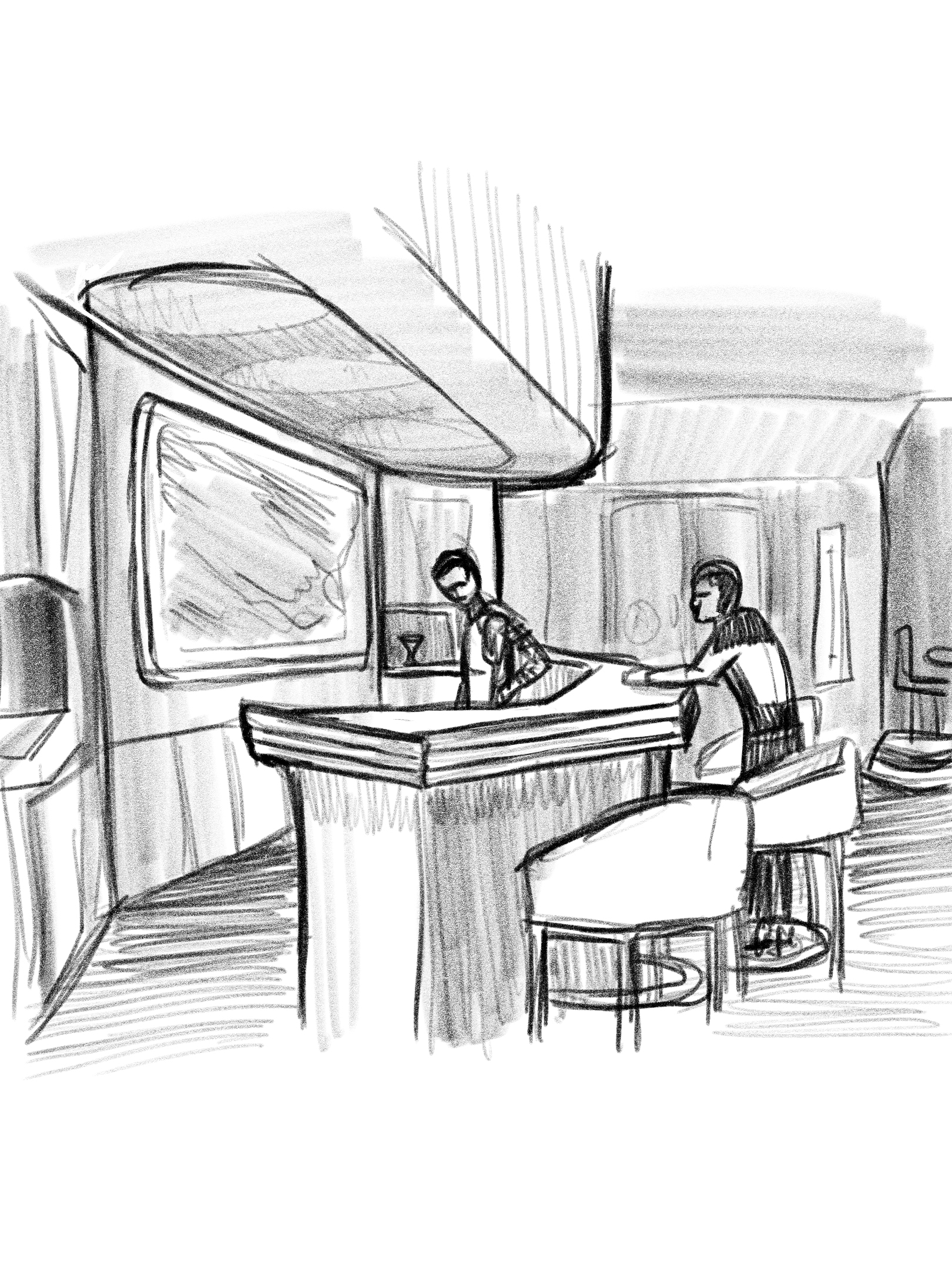 “Yes, sir,” Elliot removed the first of the two drinks, holding it in his left hand, “it’s called small talk. You ask people simple and related questions when they’re at the bar wanting to talk.” EHe swirled the glass in his hand, watching the deep blue tint at the bottom spread toward the top of the glass. “Ms. Hawthorne was up here last night talking to me about you, so I asked how long the two of you were dating as a related question,” he picked up the second drink from the replicator. “Small talk.”