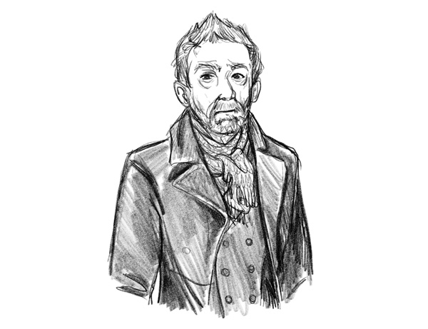 They were focused on a man with short gray hair and an unkempt moustache and beard. He wore a weathered leather coat over a double-breasted vest and a tattered scarf at his neck.