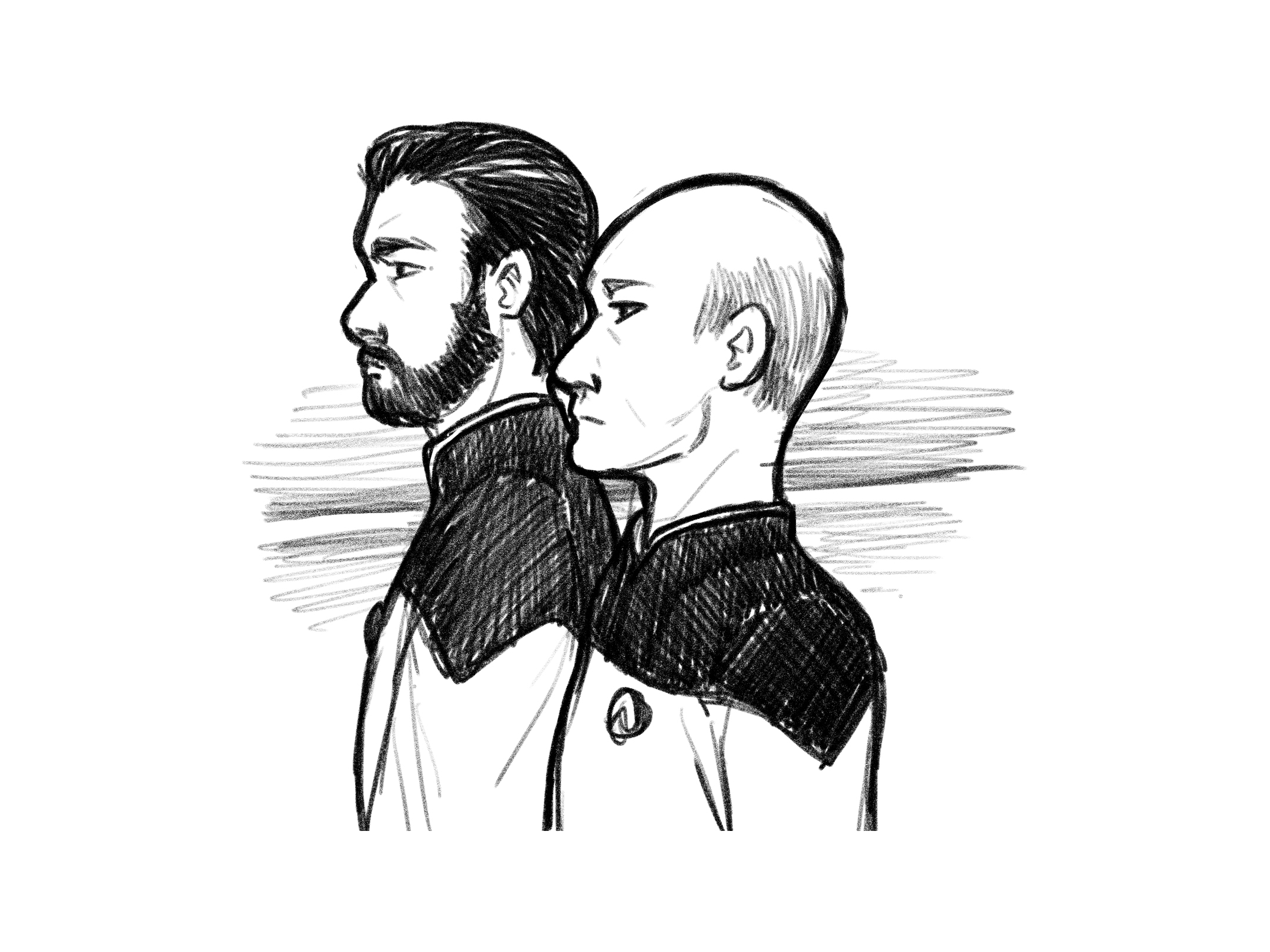 Commander Riker glanced up at Gemini and Worf, offering them a grin that stretched the beard upon his chin. His short black hair was neatly combed, and his blue eyes drifted down to meet Deanna. She smiled at him before settling her hands on her knee and looking forward. Her long, curly hair was half-pulled up in a high ponytail, and its dark brown tone contrasted her light skin and rose-colored jumpsuit.