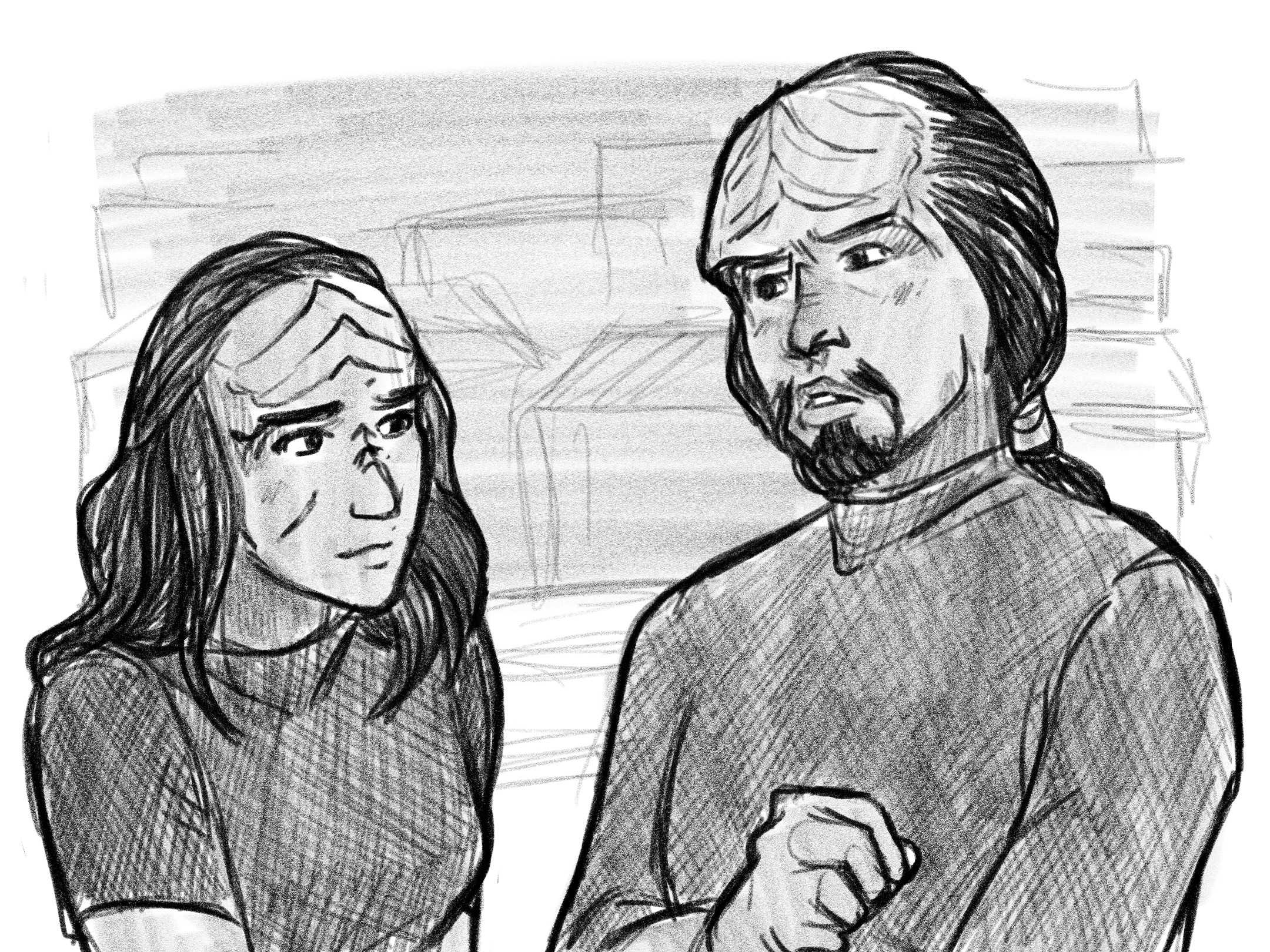 Worf instinctively looked over his shoulder out the open back door of the small hut they were sharing. “She is well,” he turned back. “No one has suspected she is not Klingon,” he paused as his eyes again drifted away, “nor has she given them reason to believe she is not.”