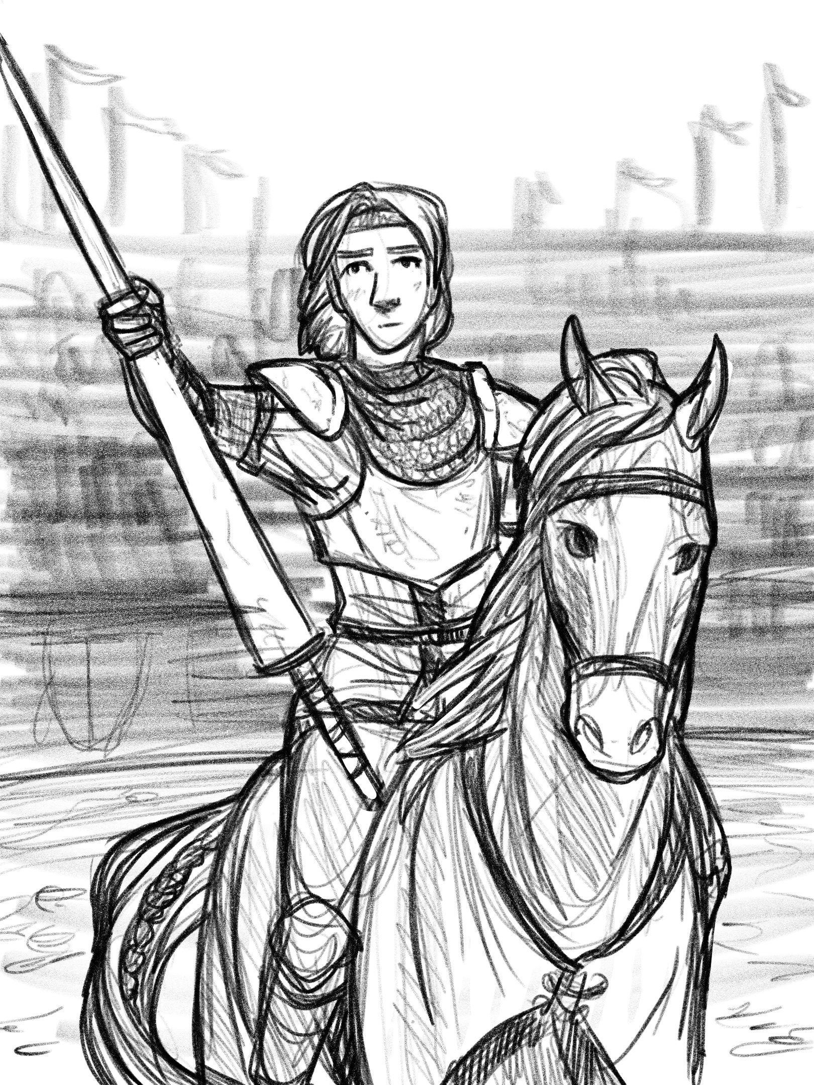Wayland’s half-grin stretched beneath his gray mustache, and he turned to retrieve Lady from her stable. He assisted Ace into the high-backed jousting saddle, then adjusted the red and black caparison beneath it that covered the mare’s white and brown fur. Lastly, he carefully attached the shield to Ace’s already tender shoulder.