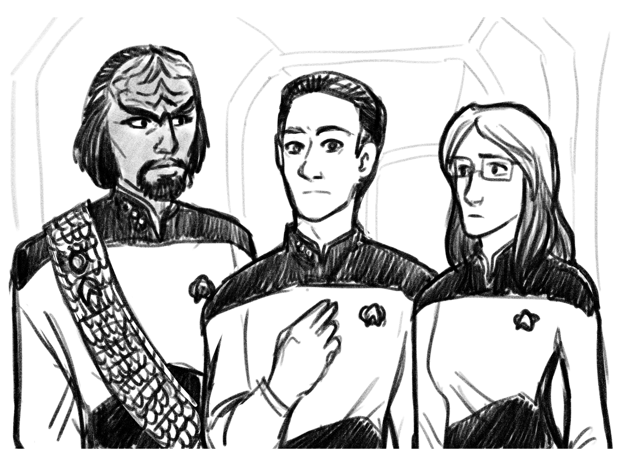A dark-skinned Klingon towered over them. The ridges of his tall forehead accented his sharp eyebrows; and his goatee, his disgruntled frown. His broad arms were crossed against his yellow uniform and metal baldric.