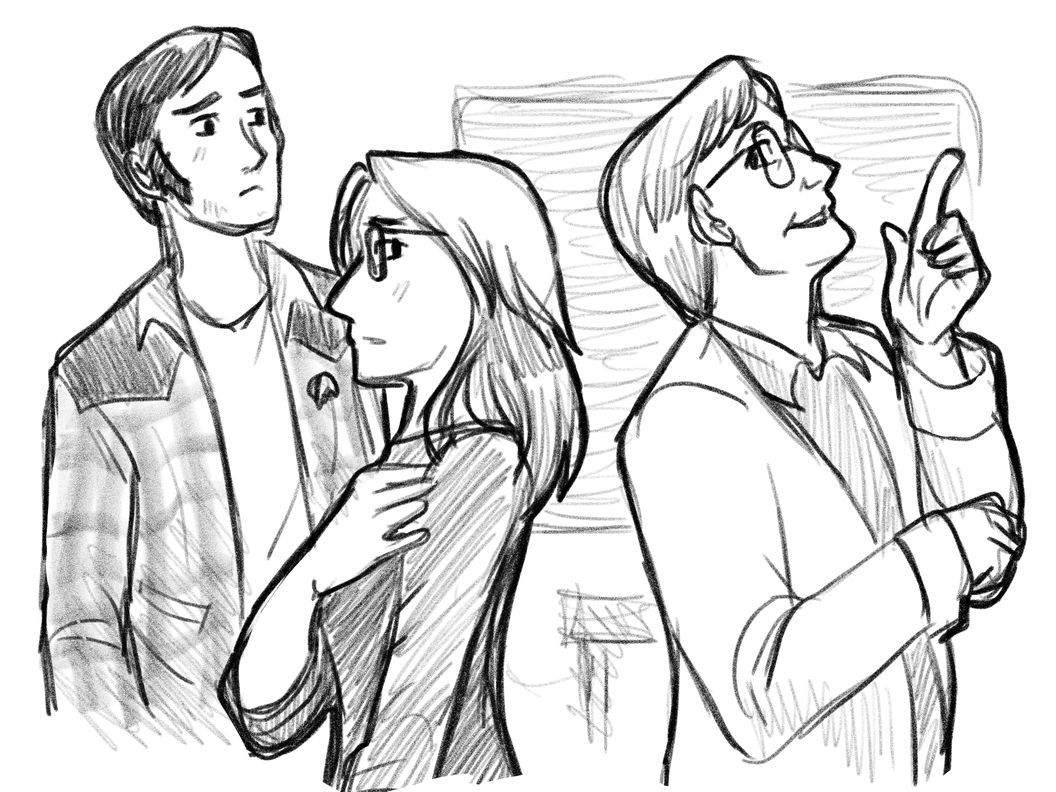“One-hundred percent,” Giorgio Hayward grinned like a child. “And when the Andorians realized that’s what was making them blue–ah,” he stopped and straightened as two figures rounded the corner into Beverly’s office. Awestruck, the man’s bespectacled eyes immediately fell to the Aravasti Lieutenant as Beverly stepped around her desk to introduce them.
